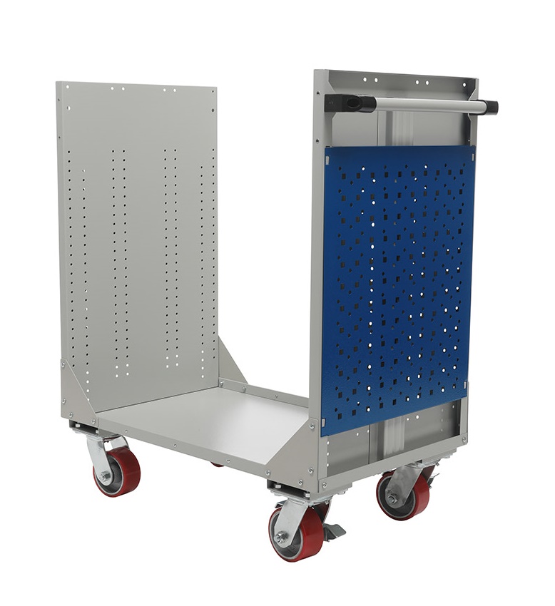 Тележка инструментальная WDS HARD предназначена для хранения и оперативного перемещения инструмента на производственных предприятиях, в автосервисах и ремонтных мастерских. Максимальная нагрузка на тележку 400 кг, на полку 100 кг.  Габаритные размеры корпуса без колес и без ручки - (ВхШхГ) 745х745х450 мм. Габаритные размеры корпуса с учетом колес - (ВхШхГ) 885х745х450 мм. Габаритные размеры корпуса с ручкой и колесами- (ВхШхГ) 885х812х450 мм. Тележка инструментальная WDS HARD комплектуется удобной ручкой, поворотными резиновыми колесами, одно колесо снабжено стояночным тормозом. Диаметр колес 100 мм. Большегрузные поворотные колеса с износостойкой шиной из полиуретана, обод выполнен из чугуна и оснащен смазочным ниппелем, в конструкции применен сварной оцинкованный кронштейн, толщина которого составляет 6 мм. В оси установлен роликовый подшипник. Поставляется в разобранном виде. Возможно установить полки SK-40, SK-50, HSK-65 и/или металлические полки для тележки WDS-Hard. Поставляются в разобранном виде