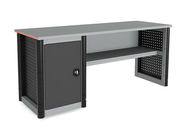 Боковые перфорированные стенки тумбы и опоры позволяют размещать на них различные стандартные аксессуары.