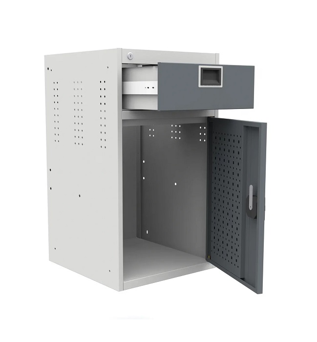 В комплектацию верстака входит: столешница 1280 SMART, тумба SMART 4, тумба SMART 1-1, тумба-пенал SMART. Столешница выполнена из фанеры 27 мм со стальной окрашенной накладкой 1,2 мм. Тумба SMART 4 комплектуется 4 выдвижными ящиками. Выдвижные ящики оборудованы телескопической системой полного выдвижения ящиков с фиксацией в закрытом состоянии (50000 циклов). Тумба SMART 1-1 комплектуется одной дверью, одним выдвижным ящиком и регулируемой по высоте полкой. Тумба-пенал SMART выдвигается на четырех телескопических направляющих и предназначена для хранения крупногабаритных инструментов и аксессуаров. Все тумбы закрываются ключевым цилиндровым замком. Секретность замка 2000 комбинаций (2 ключа в комплекте). Внутренние стенки дверей имеют универсальную перфорацию для размещения навесных элементов. Шаг квадратной перфорации (10 мм) - 38х38 мм, круглой (7 мм) - 25х38 мм. Возможна смена стороны открывания двери тумбы. Цвет верстака: корпус тумб - серый Ral 7035, столешница, двери тумб, лицевая панель ящиков - антрацит Ral 7016. Поставляется в разобранном виде.