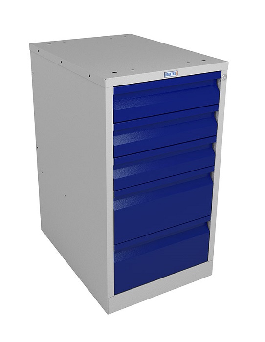 Тумба Profi WD-5 предназначена для хранения вещей, инструментов и оснастки в производственных помещениях, гаражах, мастерских. Изготовлена из высококачественного металла. Комплектуется пятью выдвижными ящиками с телескопическими направляющими. Полезные размеры ящиков (ВхШхГ): 3 ящика - 100х380х600 мм, 2 ящика - 190х380х600 мм. Грузоподъемность каждого ящика 30 кг. Ящики открываются на все длину, что позволяет использовать 100 % пространства. Тумба Profi WD-5 закрывается центральным ключевым замком Практик (1000 комбинаций). Цвет: корпус - серый Ral 7038, ящики - синий Ral 5002