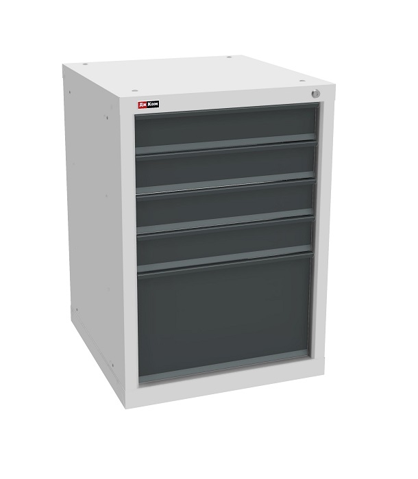 В комплектацию верстака входит: столешница ВЛ-К 200, полка и стенка ВЛ-К, две тумбы ВЛ-К-015. Столешница выполнена из фанеры (24 мм) с покрытием из оцинкованного листа металла. Тумба ВЛ-К-015 комплектуется 5 выдвижными ящиками с телескопическими направляющими. Полезный размер ящиков (ВхШхГ): 1-280х459х459 мм, 4-80х459х459 мм. Тумба закрывается центральным ключевым замком (50 000 циклов).