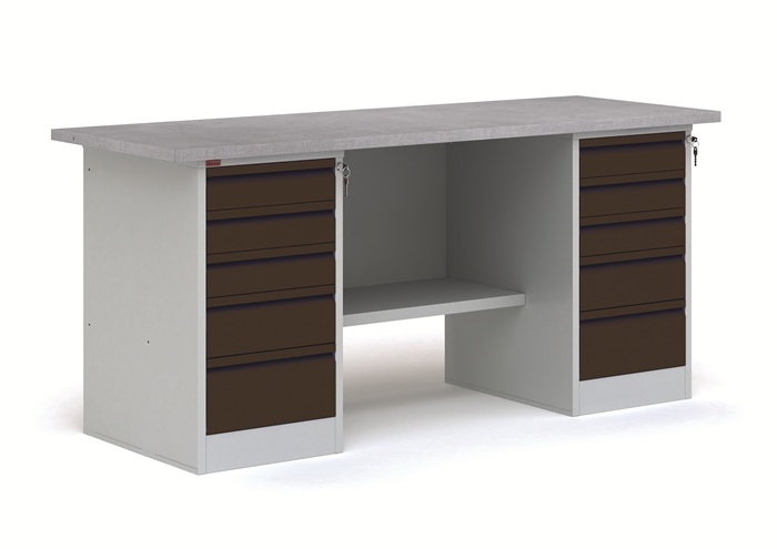 В комплект верстака ВП-6/1,6 черный входит: столешница СТ-1,6 из МДФ, покрытая оцинкованным листовым металлом, комплект К-3/1,6 (стенка задняя металлическая), две тумбы Т-2 с пятью выдвижными ящиками. Тумбы закрываются центральным ключевым замком.