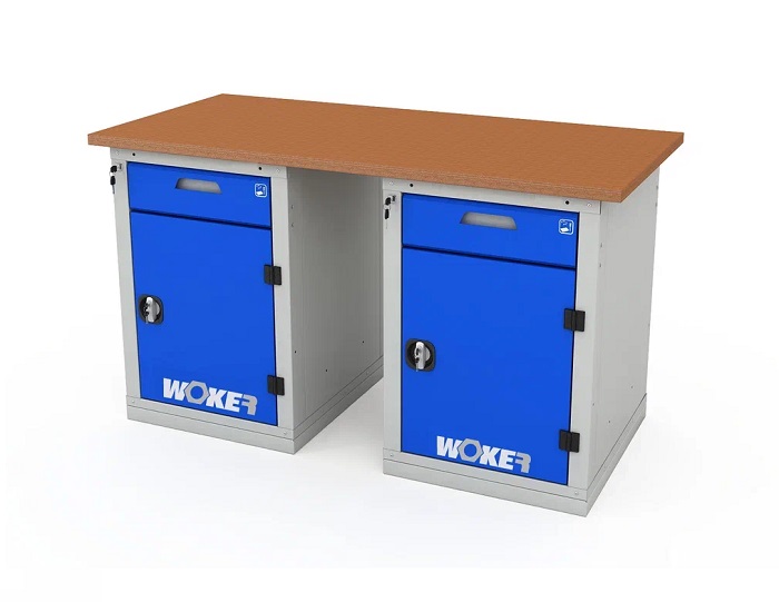 В комплектацию верстака входит: столешница Woker 1500, две тумбы Woker 02. Столешница выполнена из шлифованной березовой многослойной фанеры толщиной 30 мм. Снаружи фанера обработана влагостойким антисептиком цвета "красное дерево", что придает фанере повышенную влагостойкость и более темный цвет. Тумба Woker 02 имеет одну регулируемую по высоте полку (шаг 50 мм) и один выдвижной ящик. Ящик комплектуется противоскользящим ковриком и набором наклеек с пиктограммами для маркировки содержимого ящика. Полезный размер ящика: (ШхГ) 459х612 мм. Полки тумб установлены на стальные салазки, которые позволяют выдвигать полку на себя на 70% для облегчения разгрузки/погрузки. Дверь тумбы закрывается на цилиндрический замок со стальной поворотной ручкой, секретность замка 2000 комбинаций. Открывание двери на 180 градусов.
