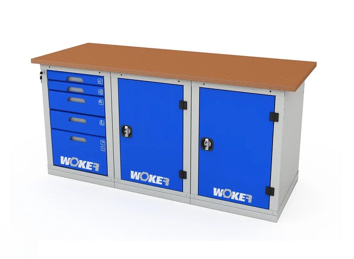 В комплектацию верстака входит: столешница Woker 1800, две тумбы Woker 01, одна тумба Woker 05. Столешница выполнена из шлифованной березовой многослойной фанеры толщиной 30 мм. Снаружи фанера обработана влагостойким антисептиком цвета "красное дерево", что придает фанере повышенную влагостойкость и более темный цвет. Тумба Woker 01 имеет две регулируемые по высоте полки (шаг 50 мм). Полки тумбы установлены на стальные салазки, которые позволяют выдвигать полку на себя на 70% для облегчения разгрузки/погрузки. Дверь тумбы закрывается на цилиндрический замок со стальной поворотной ручкой, секретность замка 2000 комбинаций. Открывание двери на 180 градусов. Тумба Woker 05 комплектуется 5 выдвижными ящиками (2 высотой - 135 мм, 2 высотой - 65 и 1 высотой - 275 мм). Полезный размер ящика: (ШхГ) 459х612 мм. В ящиках есть противоскользящие коврики и набор наклеек с пиктограммами для маркировки содержимого.